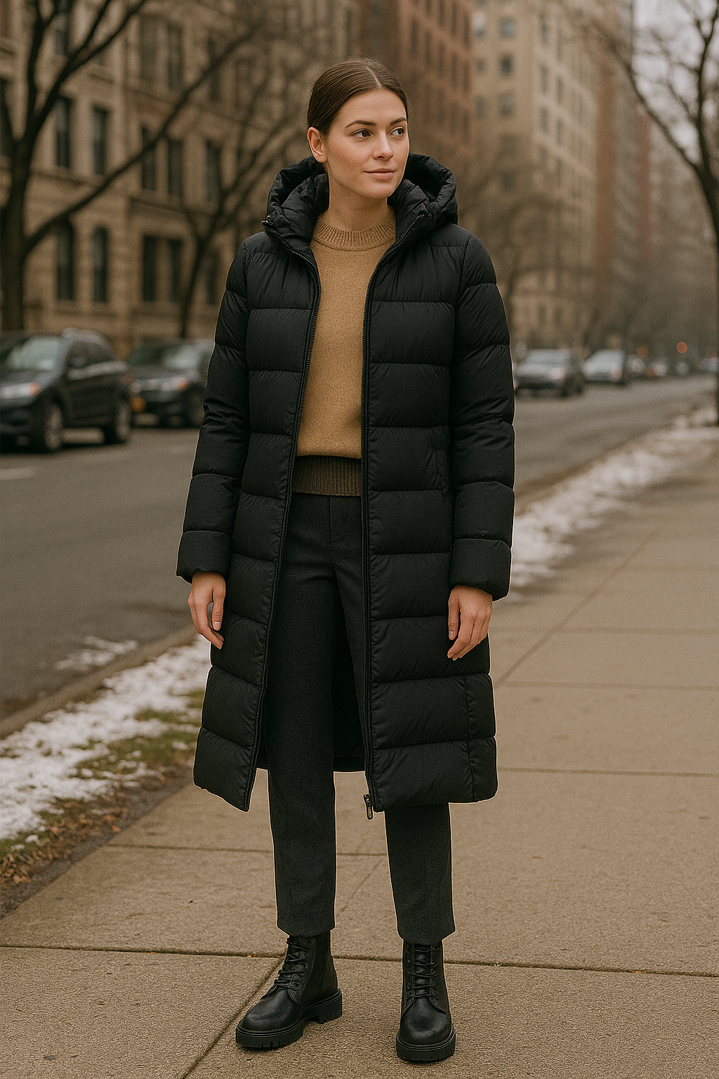 Straight-leg cuts balance the volume of a puffer coat better than skinny jeans, creating more harmonious proportions.