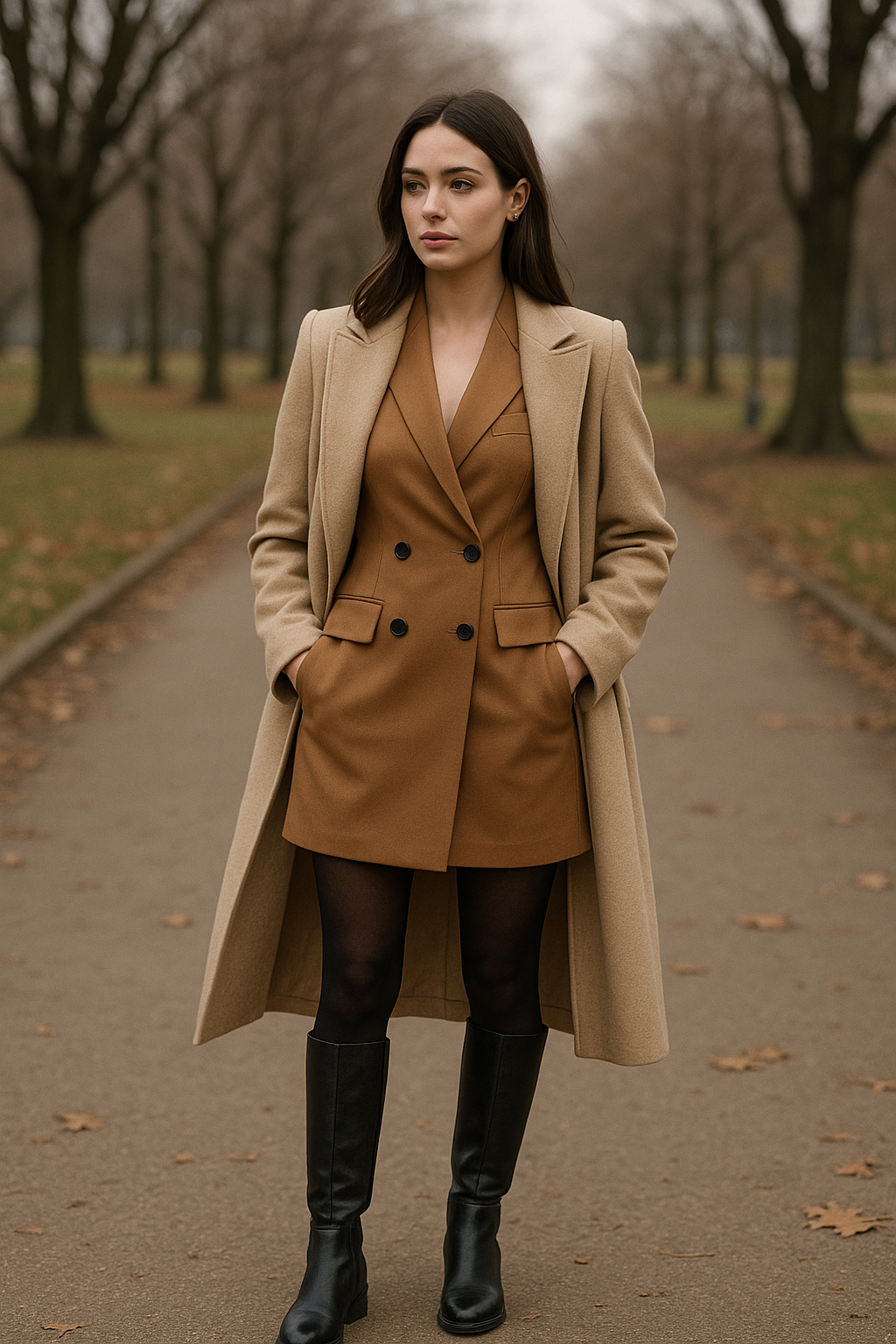 11. Blazer Dress + Thick Tights + Knee-High Boots + Classic Trench or Wool Coat Over Top