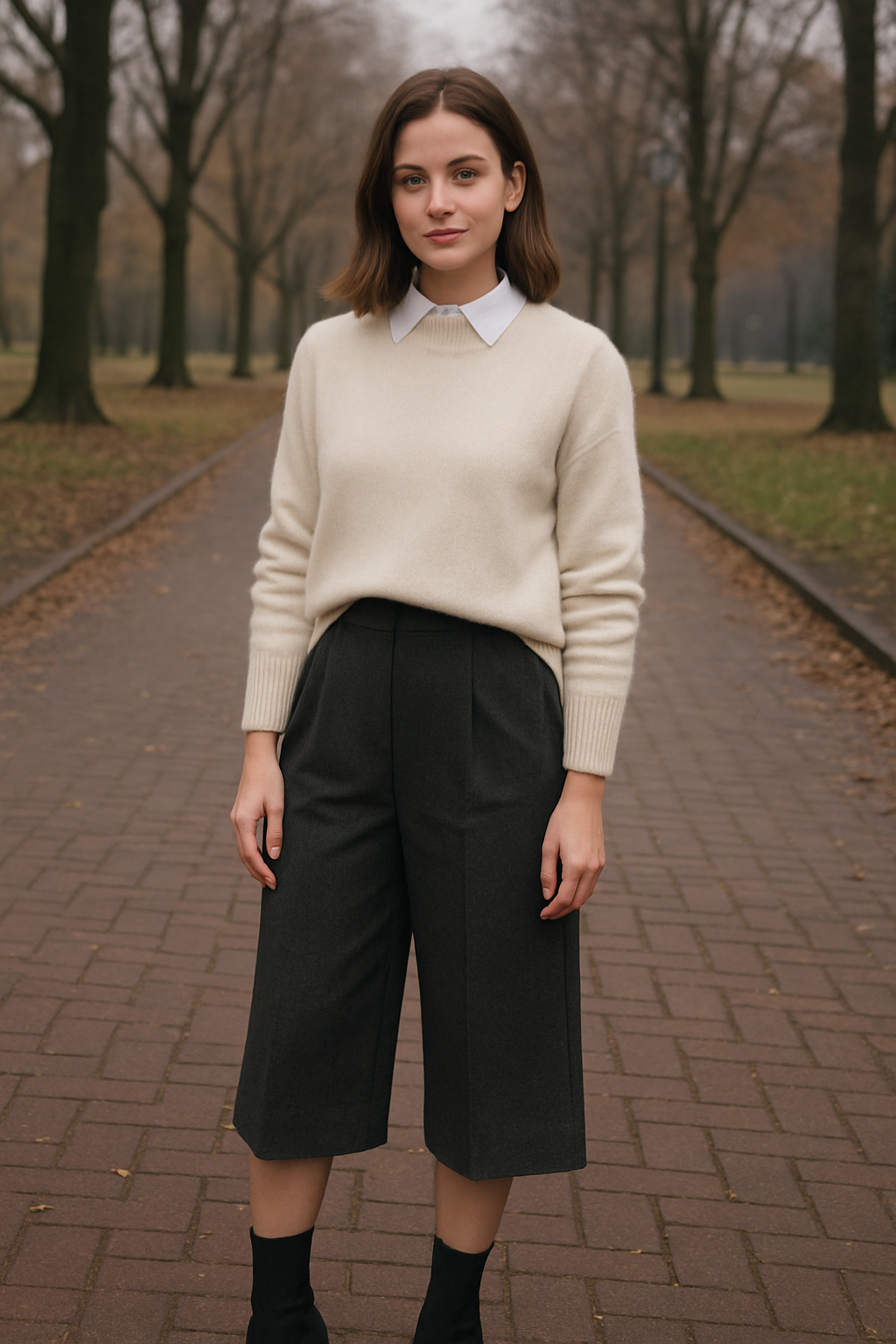 Wool culottes offer unexpected warmth compared to regular pants because the wider leg creates air pockets that insulate.