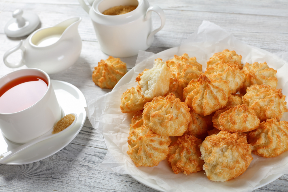 Shredded coconut, sweetened condensed milk, egg whites, and vanilla create these chewy cookies with crispy edges.
