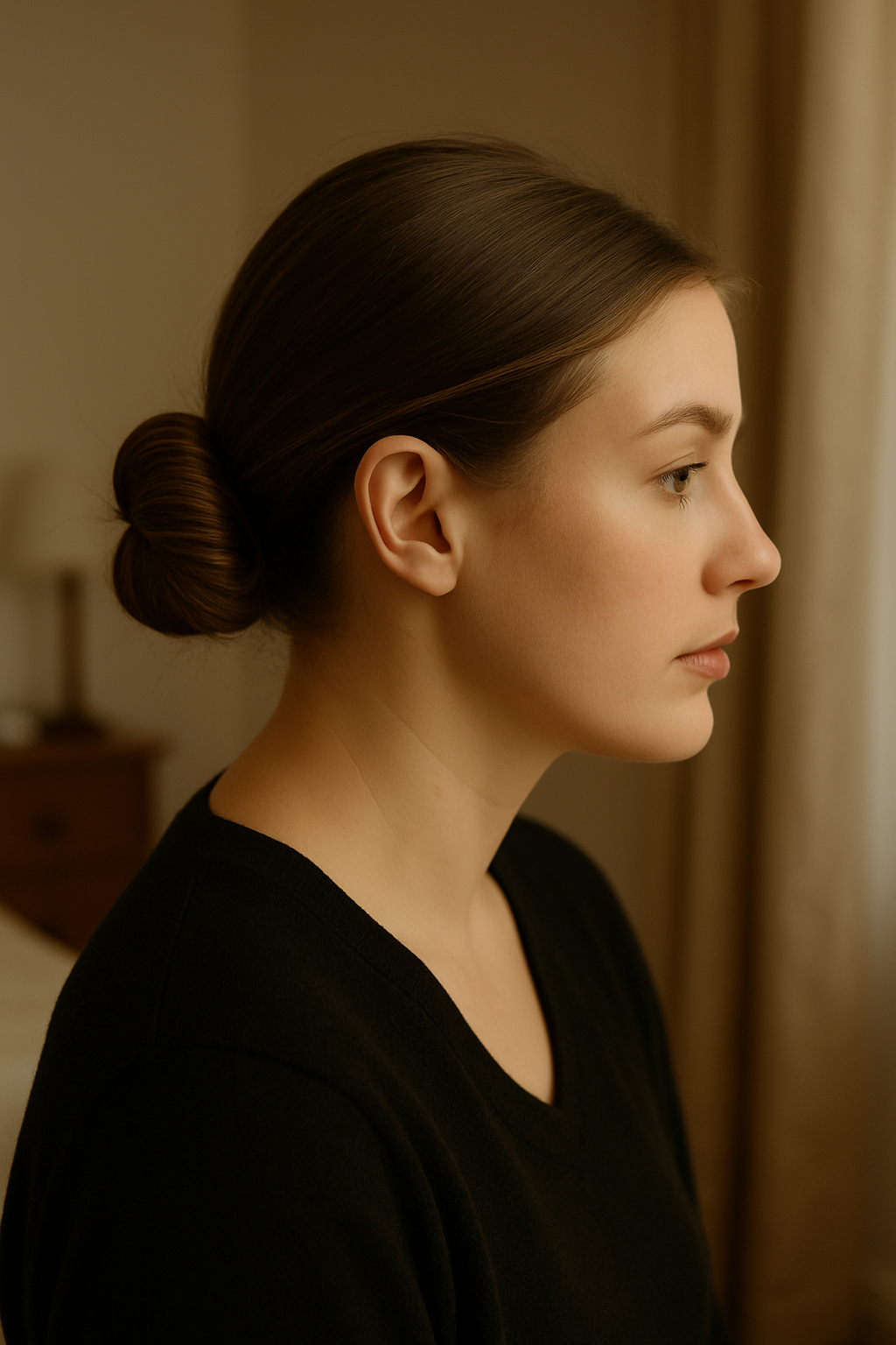 Create a deep side part, sweep all your hair to one side, and gather it at the nape of your neck or just behind your ear before twisting it into a low bun secured with pins or a hair tie.