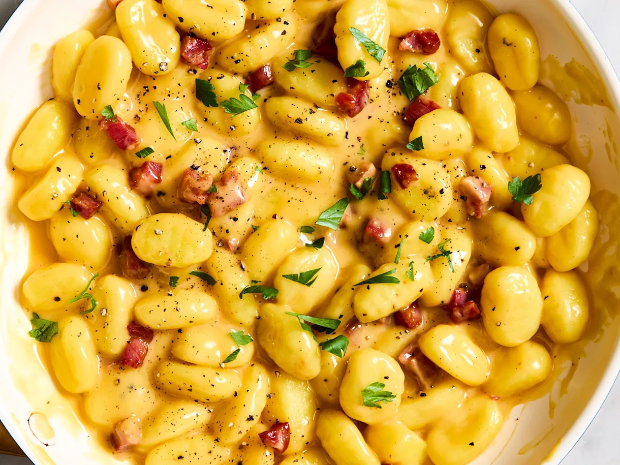 Pillowy potato gnocchi meets the classic Italian carbonara sauce in this comfort food mashup.
