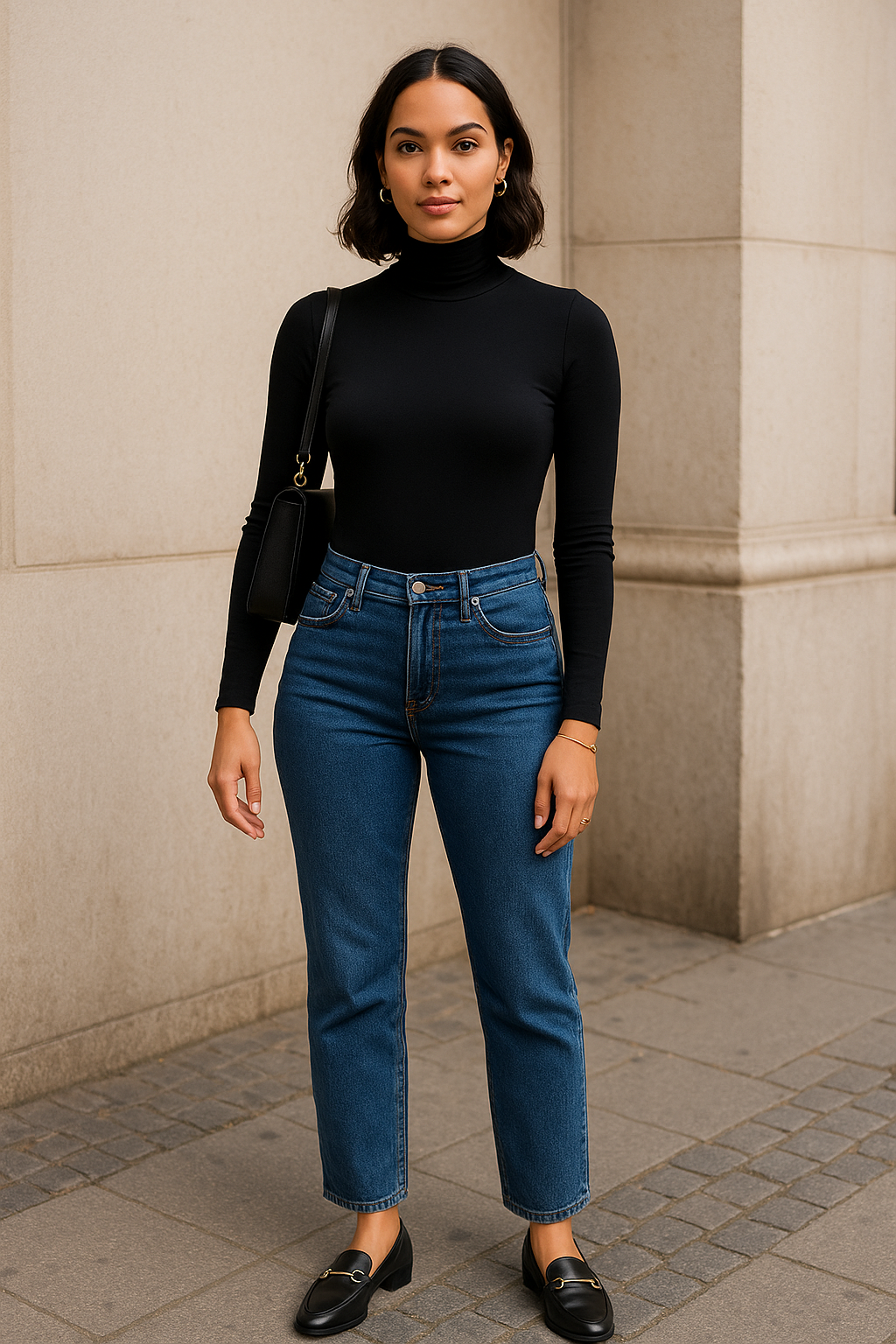 5. Turtleneck Bodysuit + Jeans + Loafers