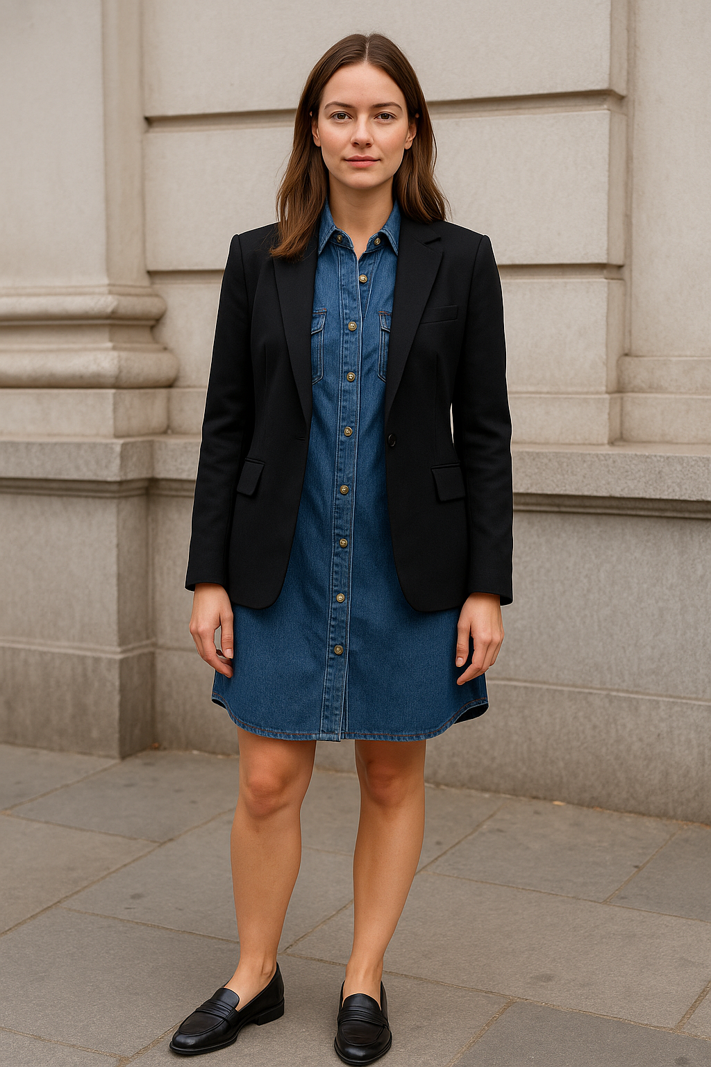 A structured blazer transforms the denim dress from basic to brilliant. The contrast between the casual dress and tailored blazer creates visual interest that catches the eye.