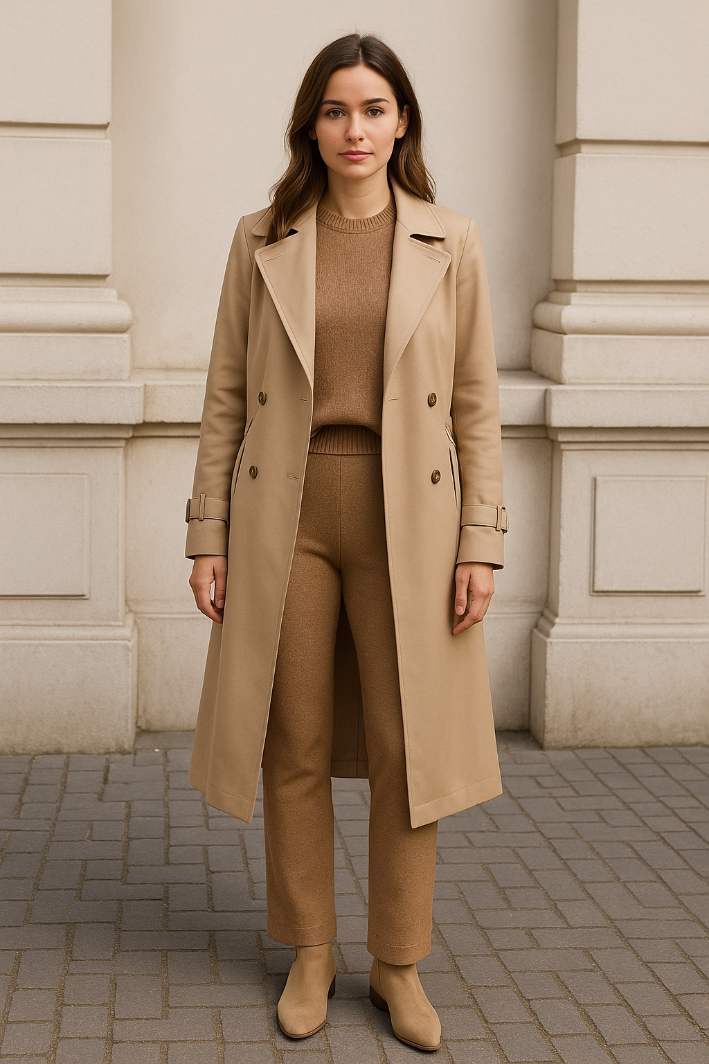 7. Matching Knit Set (Top + Pants) + Trench Coat