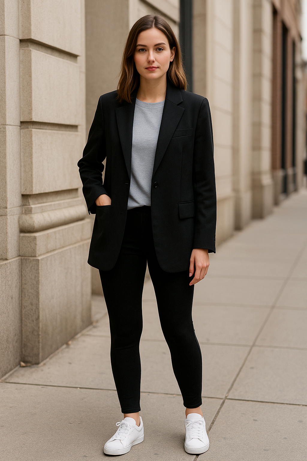 An oversized blazer provides structure and polish, balancing the fitted leggings perfectly. Choose one that hits mid-thigh or longer for the most flattering proportions.