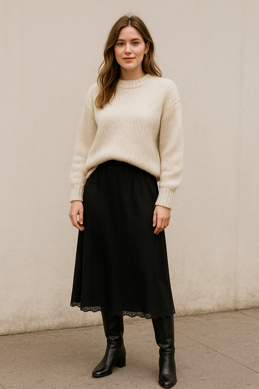 A fitted knit top balances the skirt’s volume, creating a flattering proportion. Choose a tucked-in style or a cropped length that hits right at your natural waist.