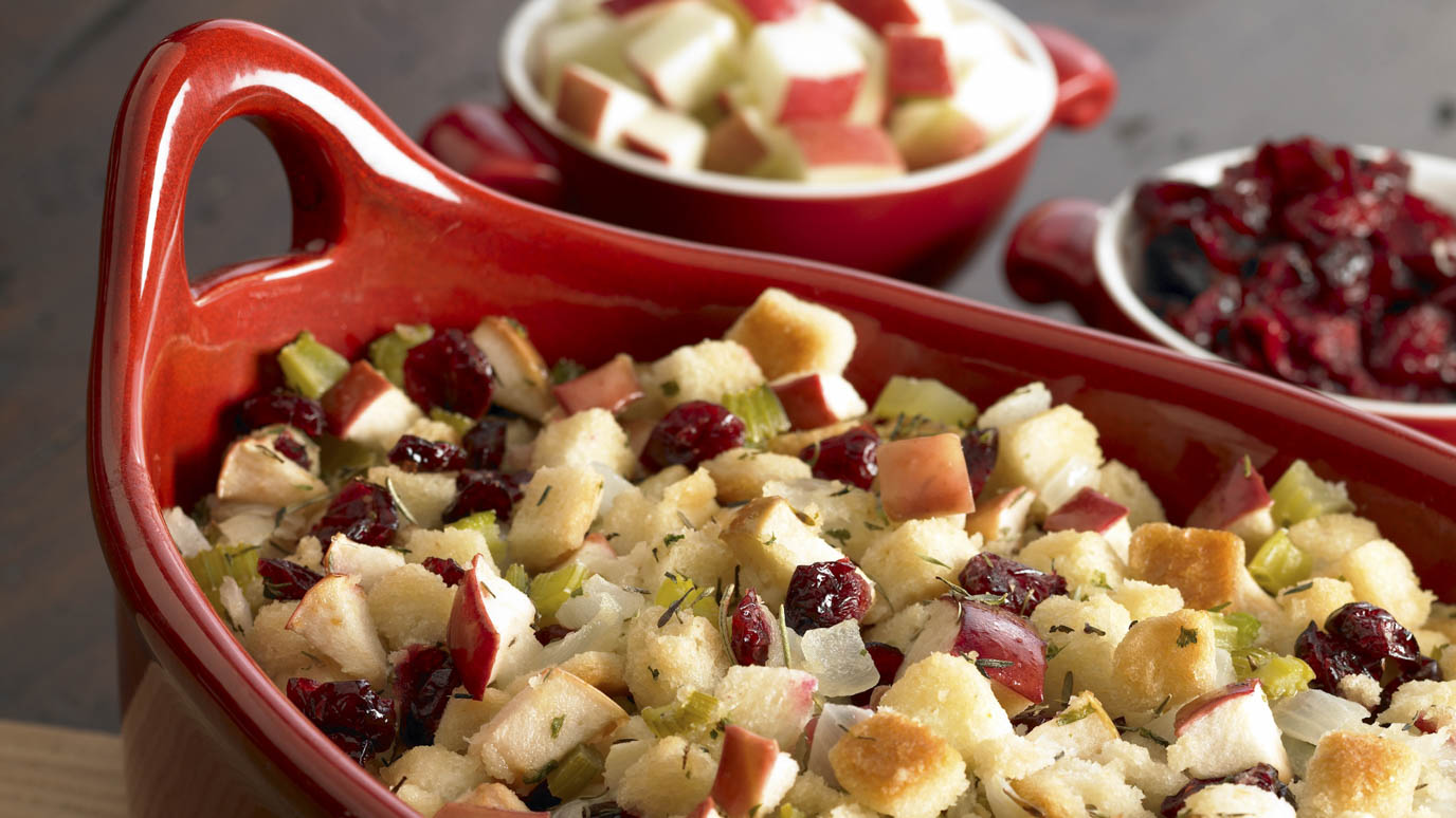 Sweet and savory flavors dance together in this festive twist on traditional stuffing that celebrates classic Christmas flavors. Tart dried cranberries and sweet apple chunks add bursts of flavor throughout the herb-seasoned bread base.