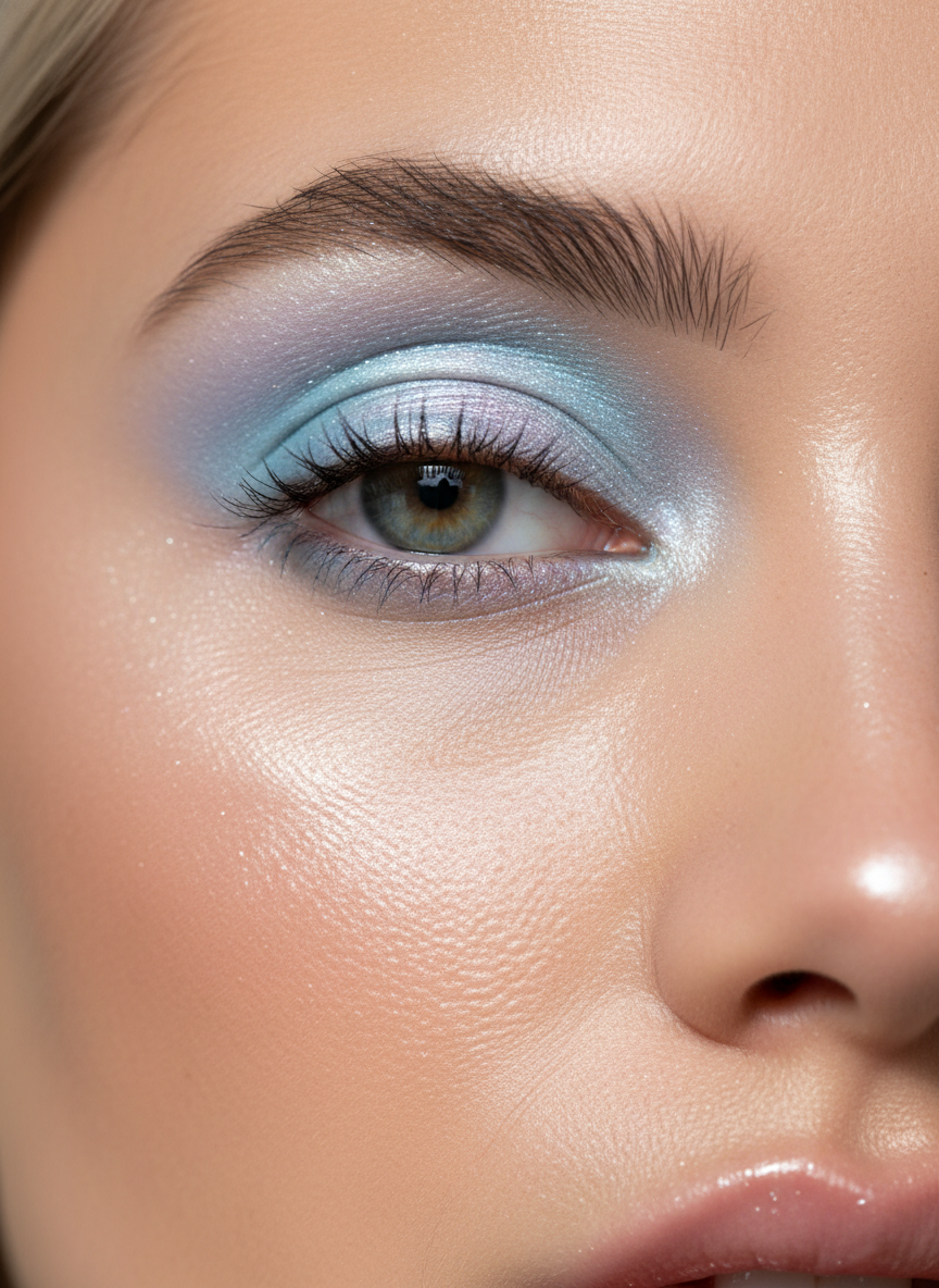 Y2K pastel eyes bring back frosty blue shadows, shimmery lilac lids, and that iconic white inner-corner highlight that defined an entire generation of celebrity red carpets.