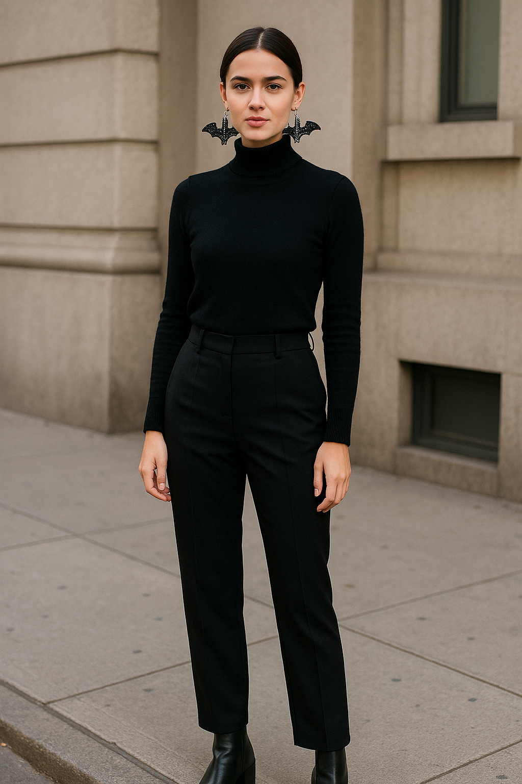 An all-black outfit is timeless, sophisticated, and incredibly easy to pull together. Pairing it with a single bold accessory like bat earrings transforms your look into something seasonally appropriate without screaming Halloween.