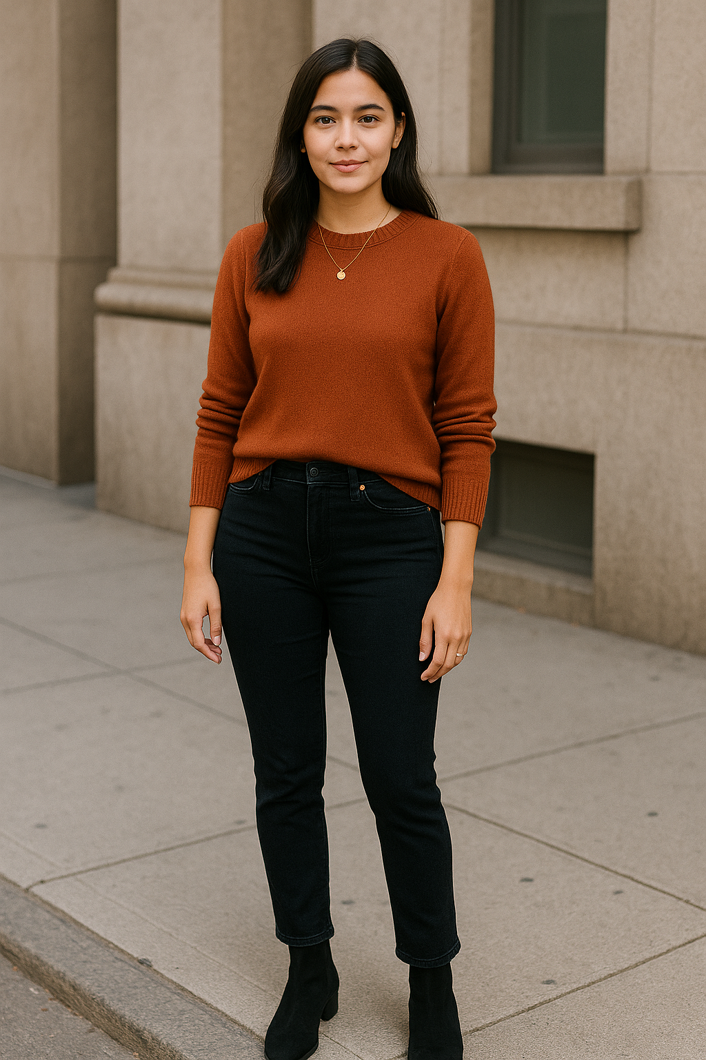 Nothing says autumn quite like a warm rust or burnt orange sweater. Paired with dark jeans and ankle boots, this outfit captures the essence of fall without looking like you tried too hard.