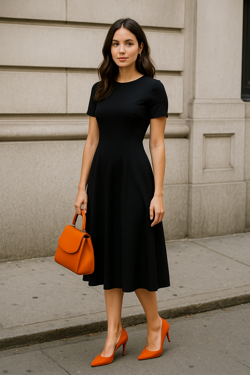 This approach works because the black dress keeps things elegant while the orange accessories provide that seasonal pop of color. The contrast is eye-catching without being overwhelming.