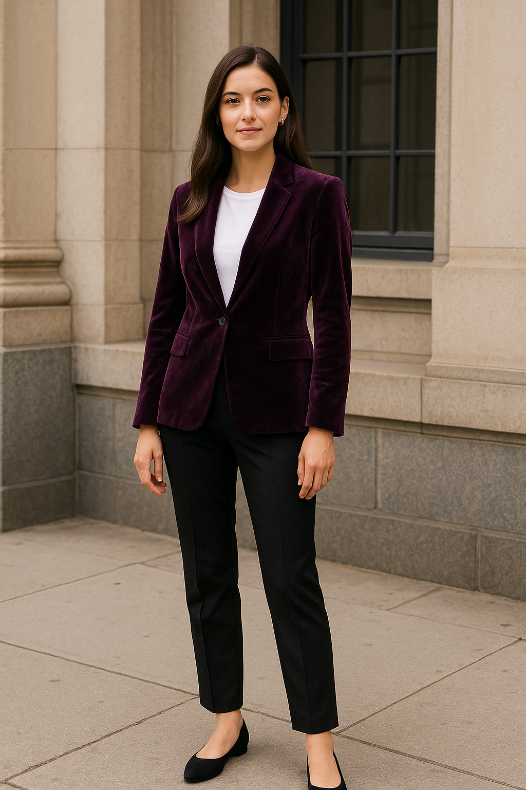 4. Velvet Blazer in Deep Jewel Tone with Black Trousers