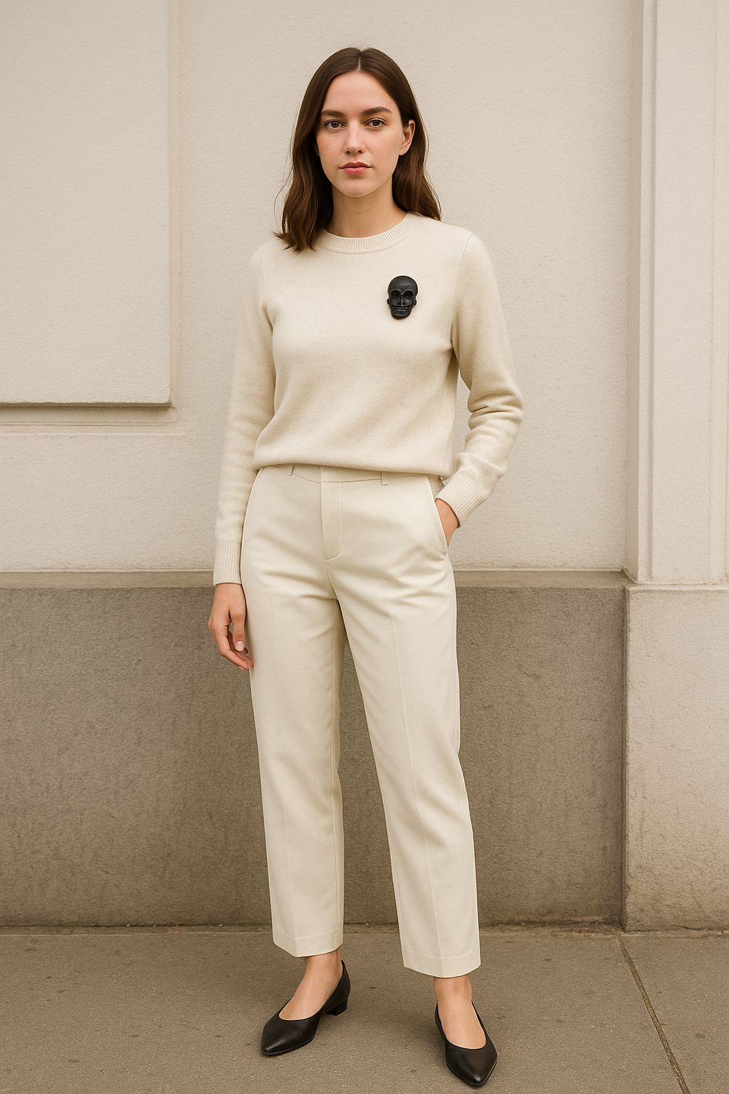 Monochrome dressing in soft, neutral tones creates a clean and modern look. When you add a single dark accent like a skull brooch, you introduce just enough Halloween spirit without overwhelming the outfit.