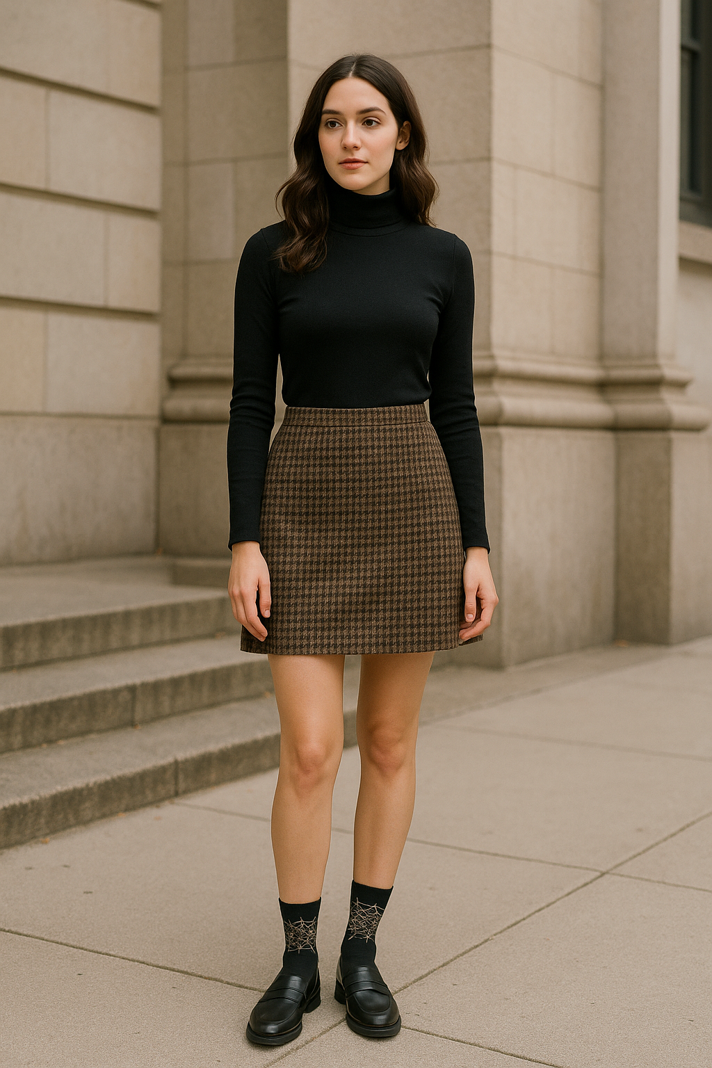 Dark academia style has taken over fashion lately, and it’s naturally suited to Halloween aesthetics. A tweed skirt paired with a fitted turtleneck creates a scholarly, vintage-inspired base for your outfit.