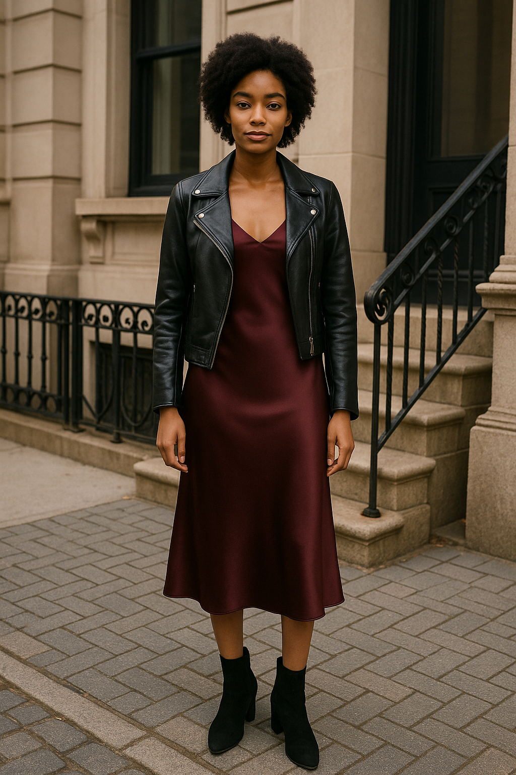 Finish with ankle boots or strappy heels and minimal jewelry. The contrast between the soft, feminine slip dress and the tough leather jacket creates an interesting dynamic that feels current and stylish.
