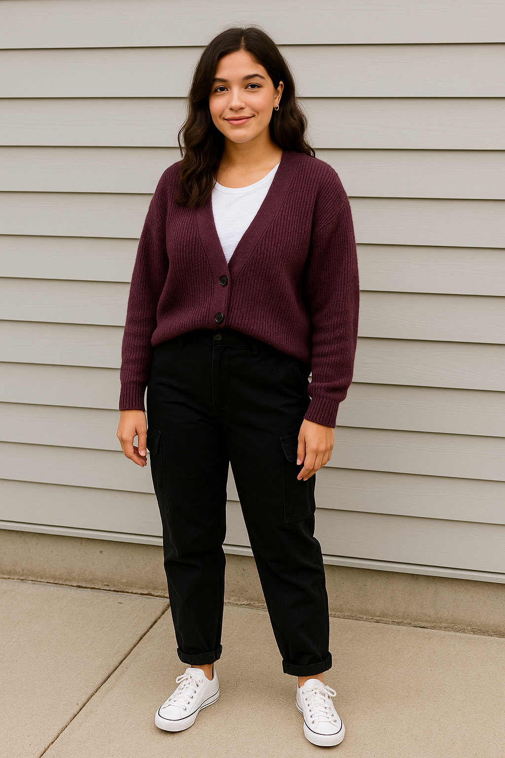 10. Eggplant Knit Cardigan with White Tee and Black Cargo Pants