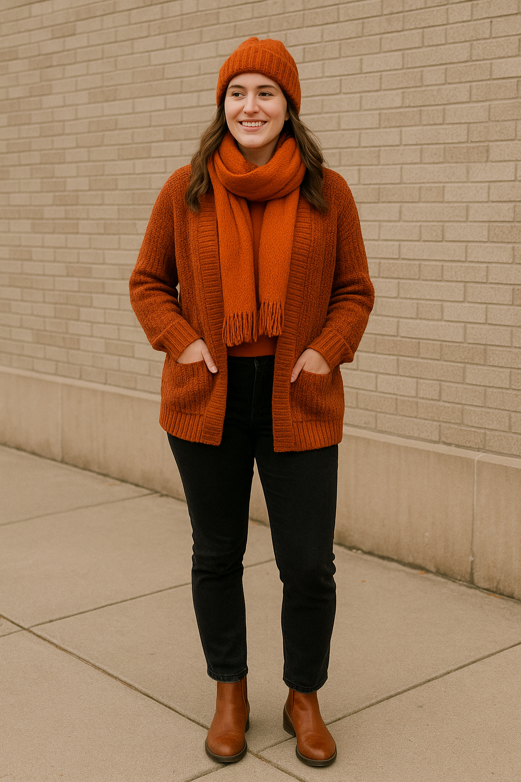 12. Cozy Rust Cardigan with Black Jeans and Pumpkin-Orange Beanie