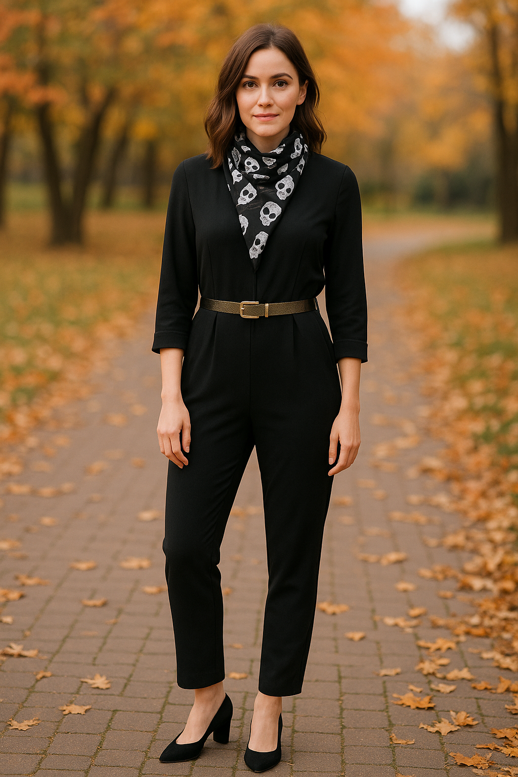 11. Black Jumpsuit with Metallic Belt and Skull-Print Scarf