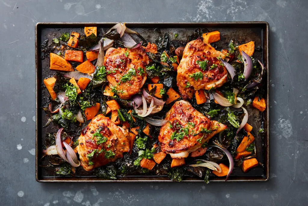 9. Sheet-Pan Chicken Thighs with Red Cabbage & Sweet Potatoes