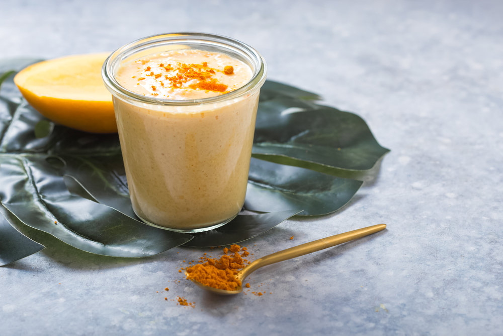 Combine one teaspoon of turmeric powder, half a teaspoon of cinnamon, mango, banana, coconut milk, and a pinch of black pepper. The black pepper helps your body absorb curcumin up to two thousand percent better—no joke!