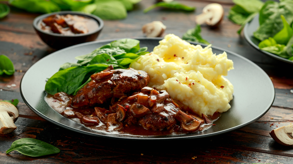 Salisbury steak is basically a fancy hamburger patty without the bun, smothered in brown gravy and often served with mushrooms.