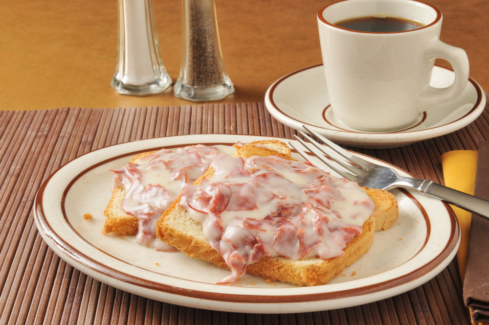 Chipped beef on toast uses dried, salted beef in a white cream sauce poured over toasted bread.