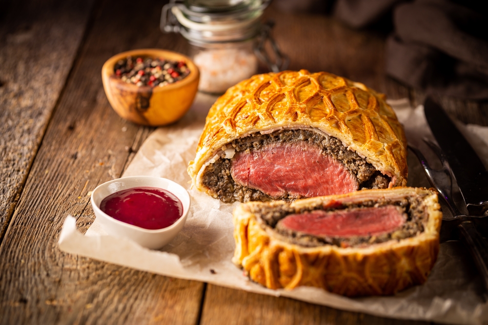 Beef Wellington wraps a beef tenderloin in mushroom paste and pâté, then encases everything in flaky puff pastry.