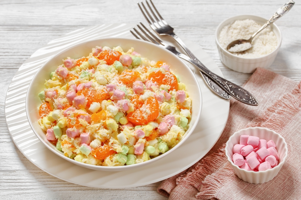 Ambrosia salad mixes canned fruit, shredded coconut, miniature marshmallows, and whipped cream or sour cream.