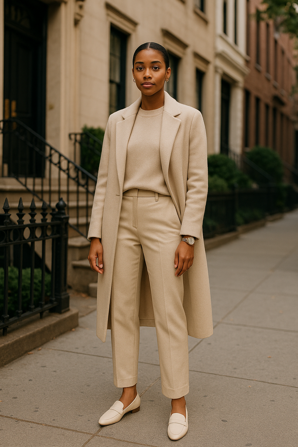 Choose matching pieces in the same neutral tone—think a beige sweater with beige pants and a beige coat.