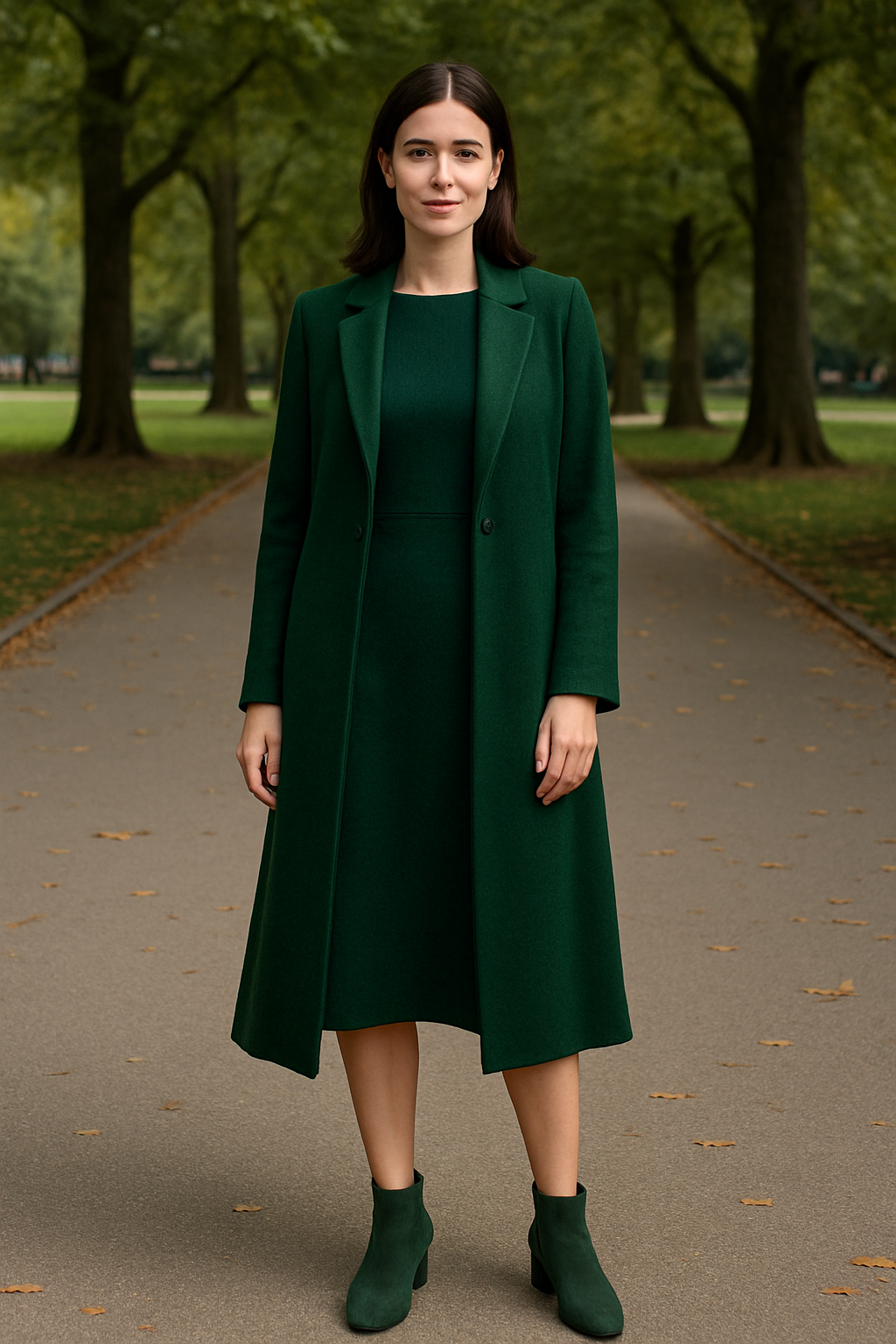 For colder weather, try a forest green dress with a matching wool coat and green ankle boots.