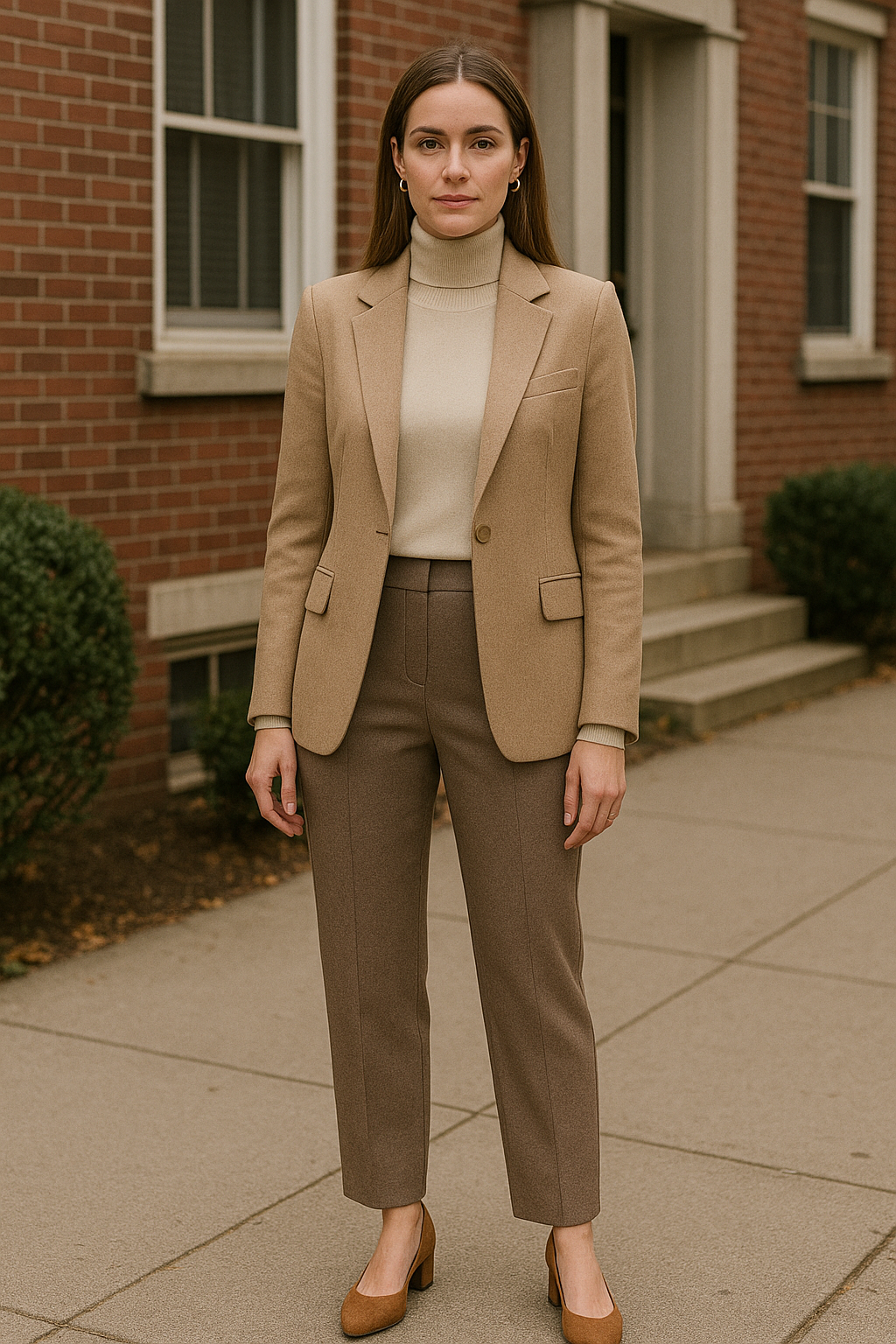 Layer a cream turtleneck under a beige blazer with taupe pants for an outfit that whispers sophistication.