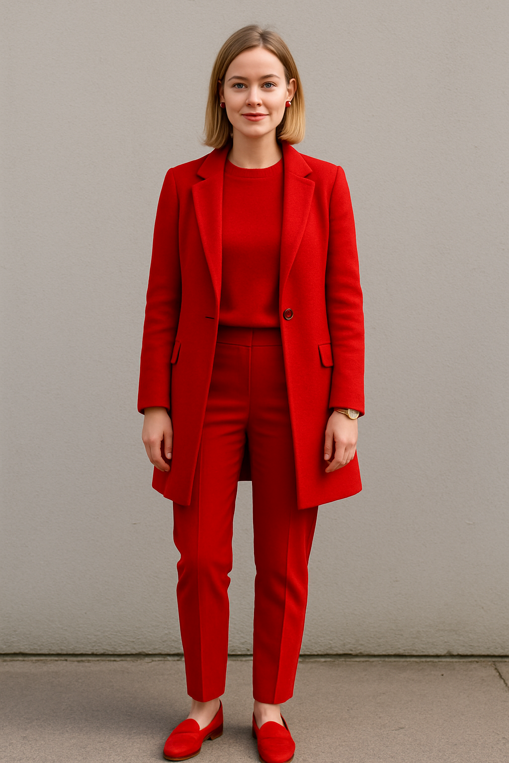 A red sweater with red pants and red shoes shows confidence and style awareness.