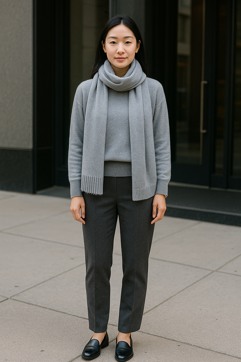 Wear dark grey pants with a medium grey top and a light grey scarf or jacket.