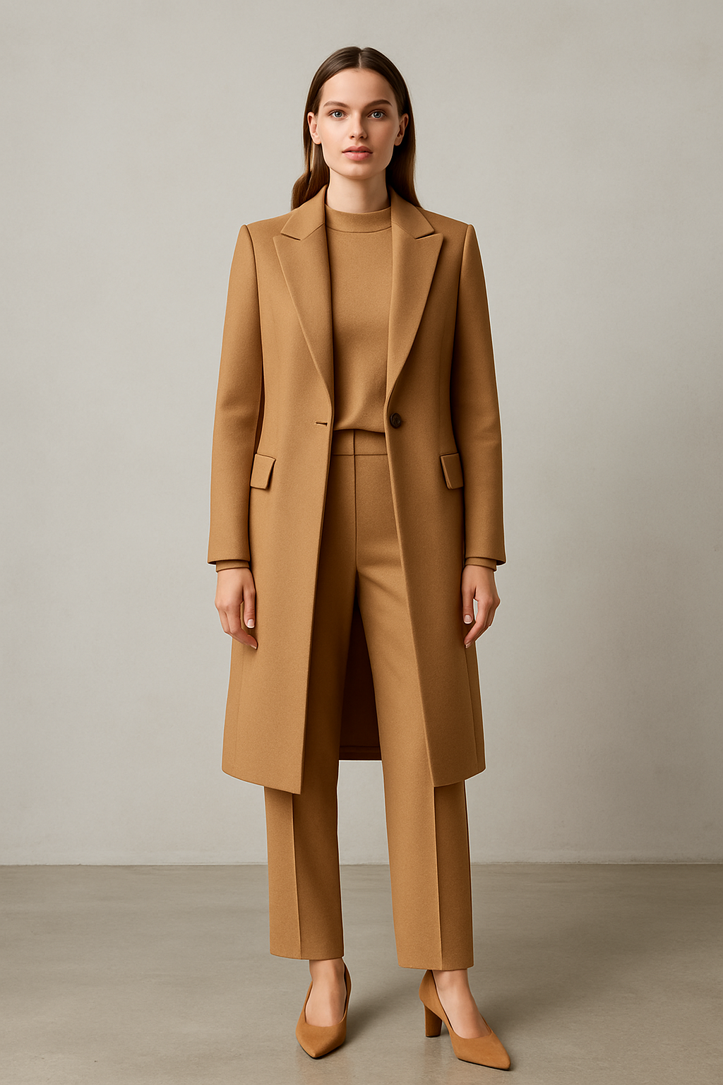 Camel tailored pants with a matching camel coat looks expensive and chic.