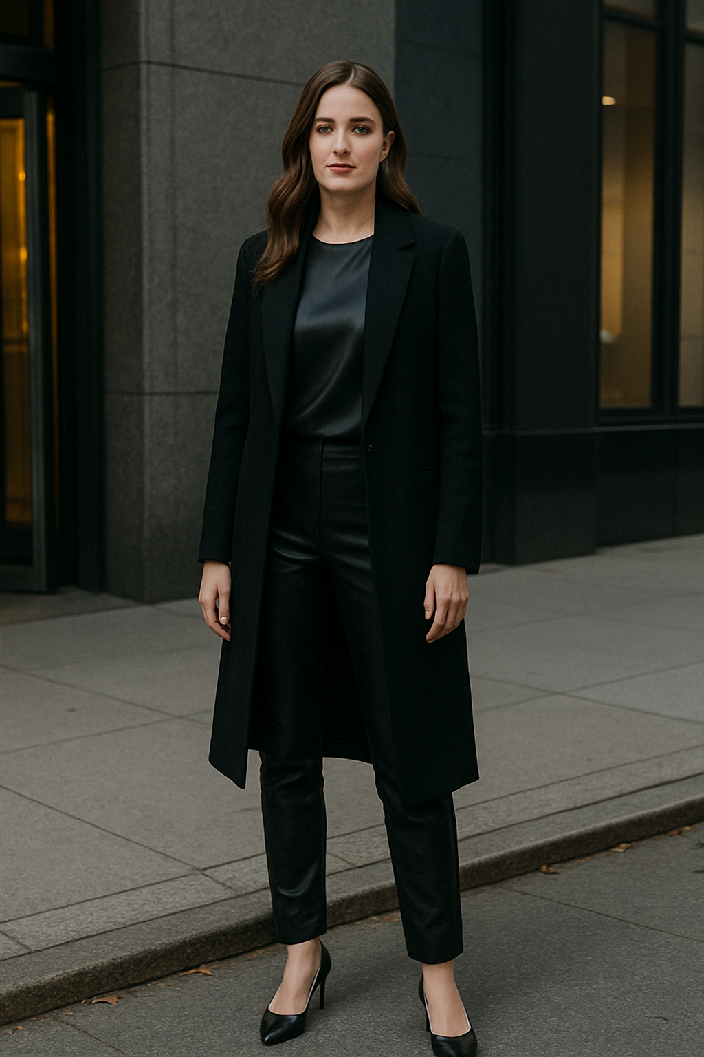 A satin blouse with leather pants and a cashmere coat, all in black, looks incredibly chic.