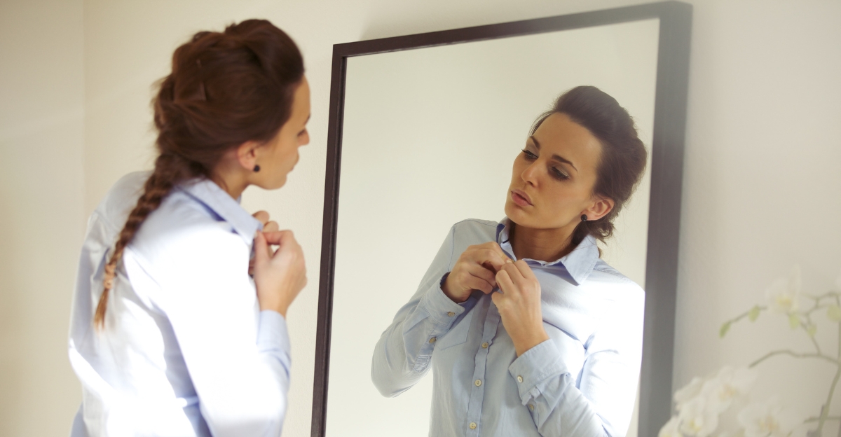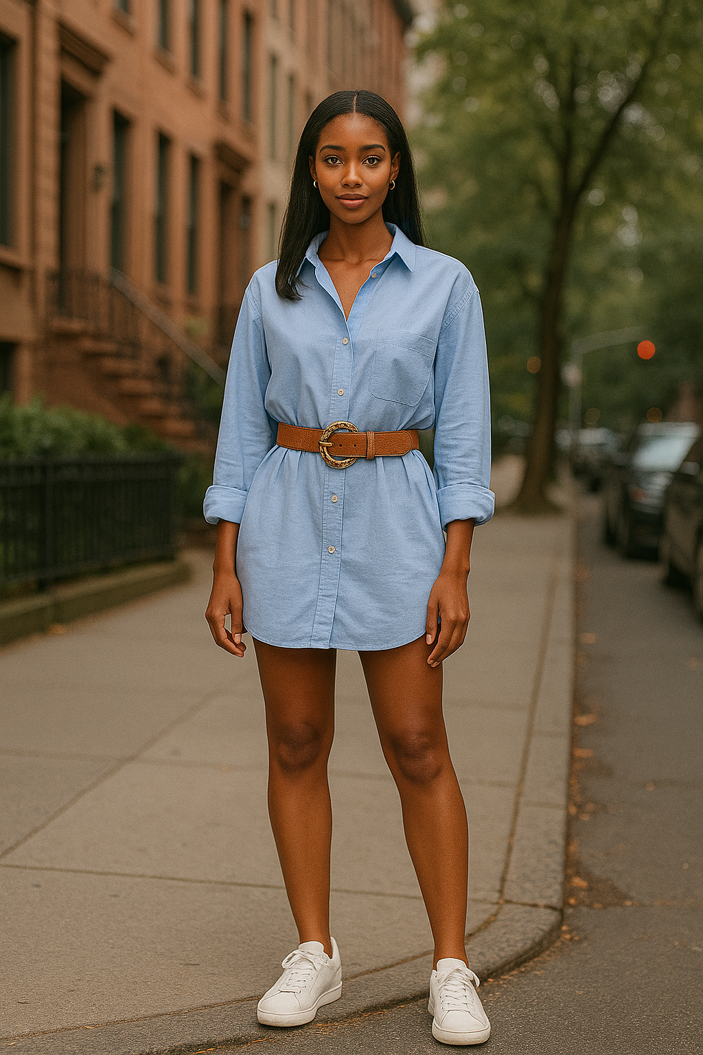 The contrast between the loose shirt and the defined waistline creates an hourglass effect that’s both feminine and modern.
