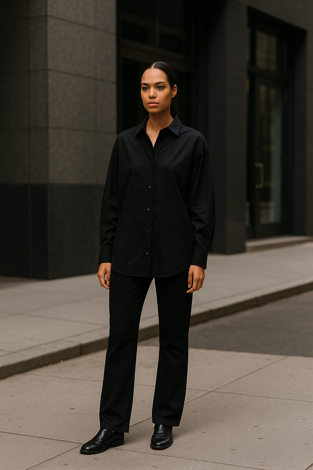 Matching your oversized shirt to your bottoms in the same color creates an instantly elevated, intentional look that feels both sophisticated and comfortable.