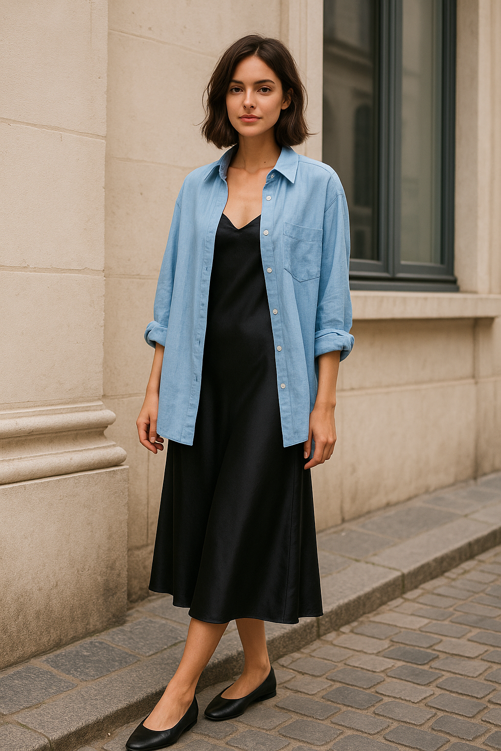 The contrast between the soft, feminine slip and the relaxed, boyfriend-style shirt adds visual interest and keeps things feeling fresh.