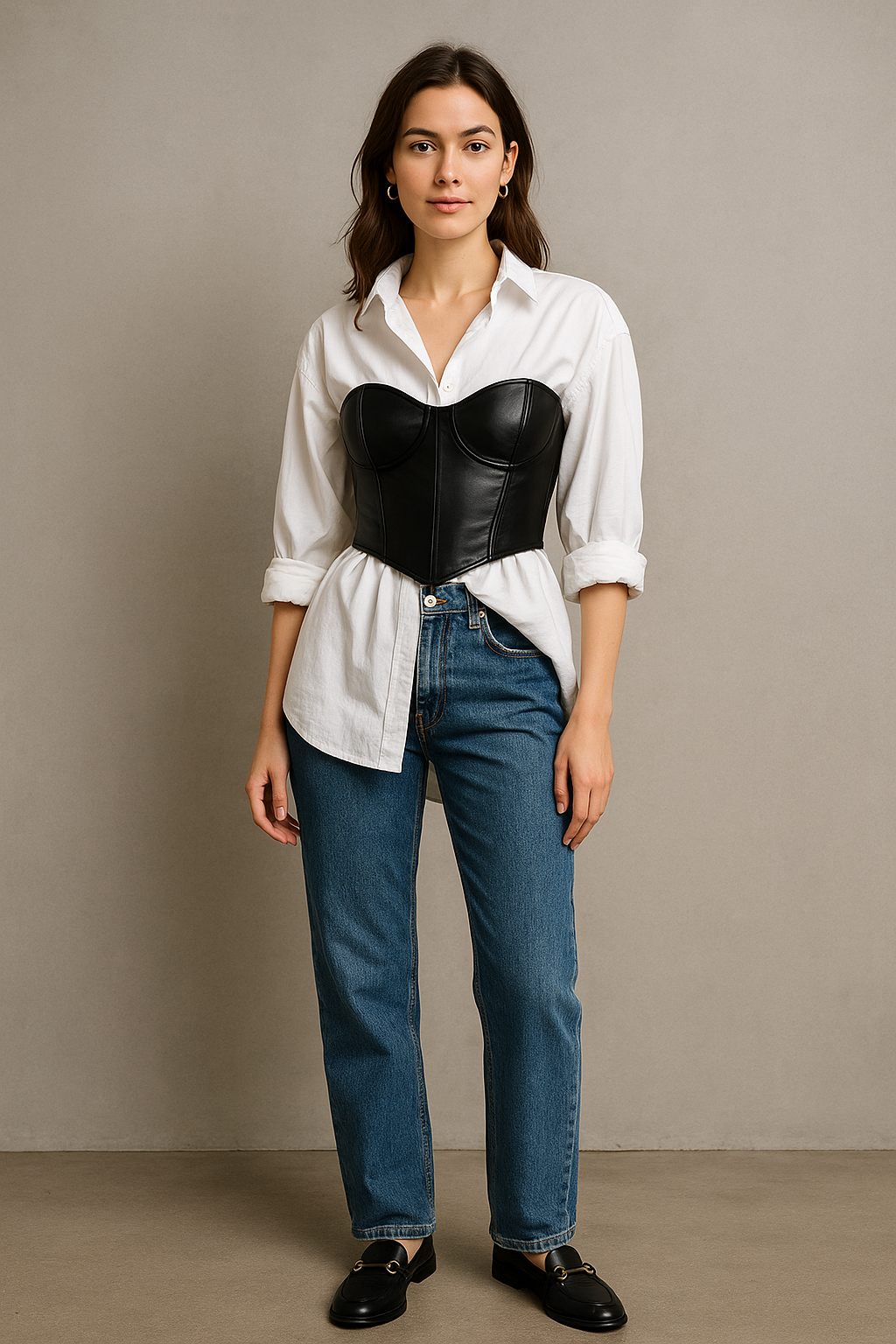 This combination balances the loose, relaxed shirt with the fitted, defined shape of the corset, creating a fashion-forward outfit that turns heads.