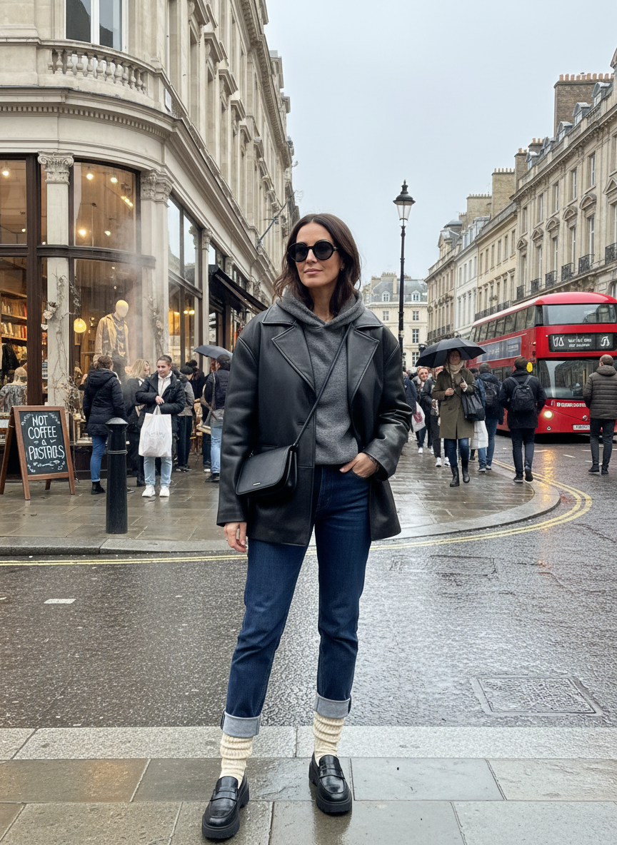 A boxy leather jacket layered over a soft cashmere hoodie creates an unexpected contrast that feels both tough and cozy.