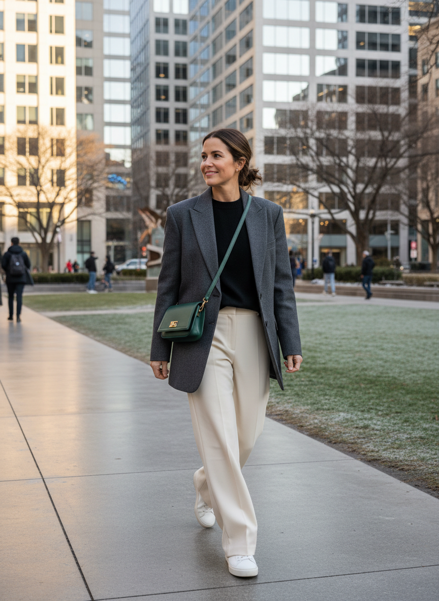 Sleek sneakers keep the look grounded and walkable, proving that athletic footwear can absolutely work in dressier contexts.