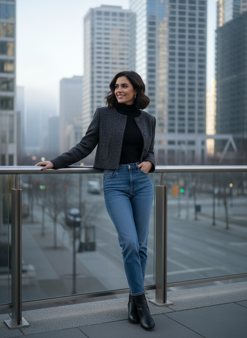 A cropped wool jacket paired with high-waisted jeans emphasizes length in the legs while keeping your core warm.