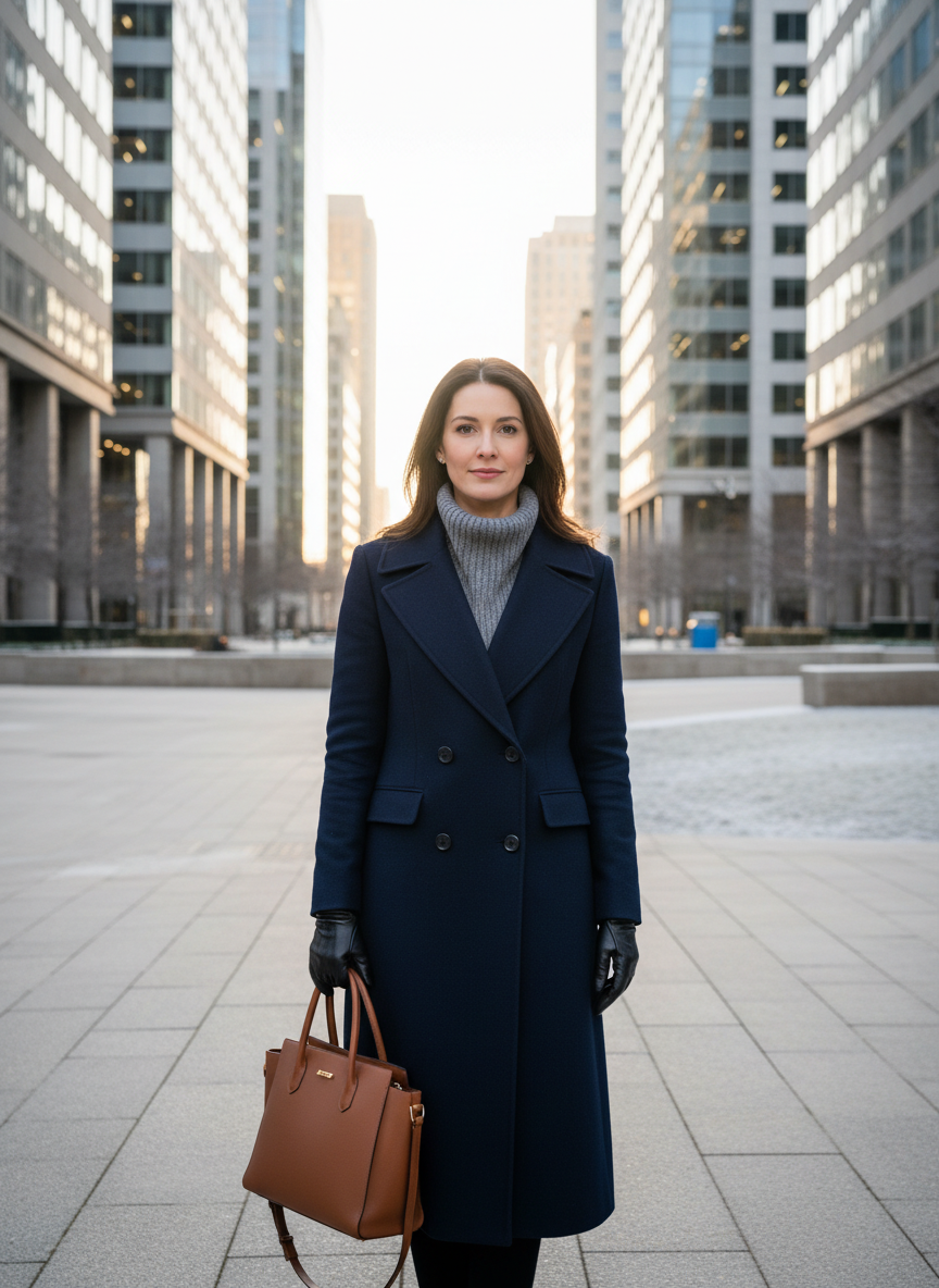 Choose a double-breasted coat in navy, charcoal, or camel for timeless appeal.