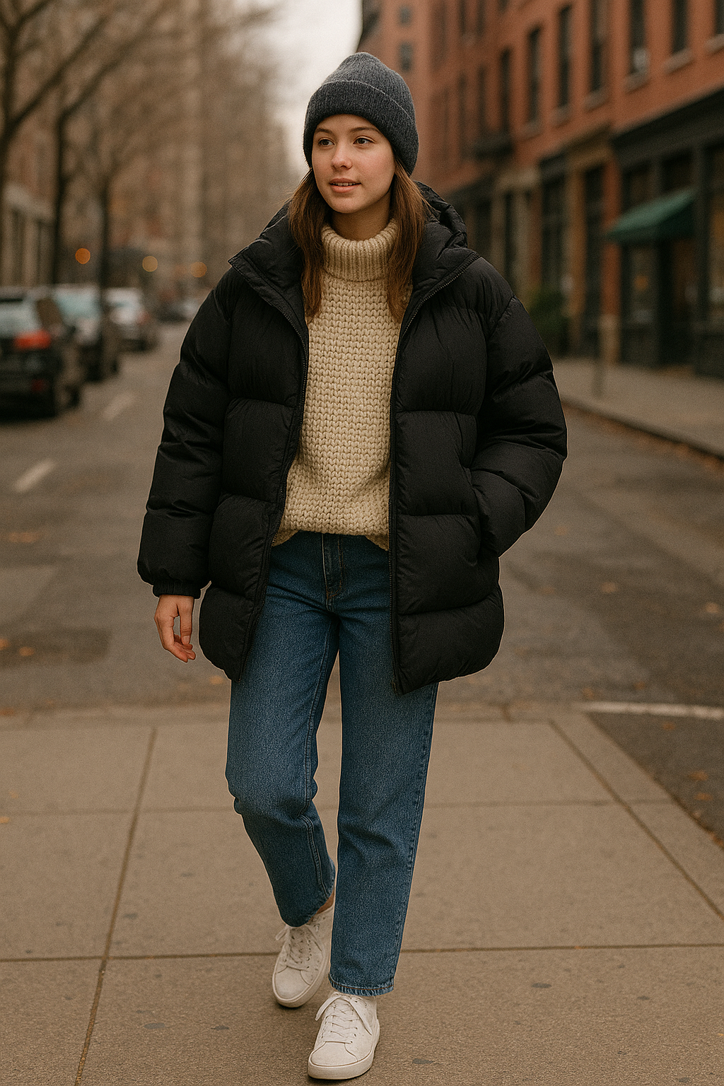 2. Oversized Puffer Jacket + Chunky Knit + Straight-Leg Jeans