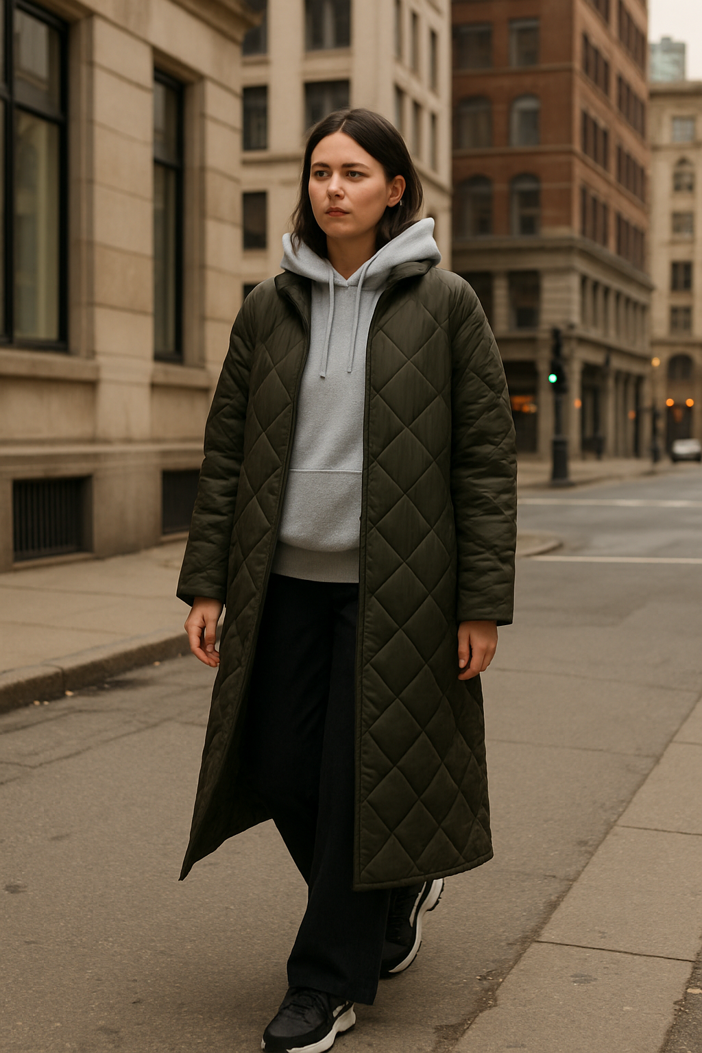 5. Longline Quilted Coat + Hoodie + Wide-Leg Pants