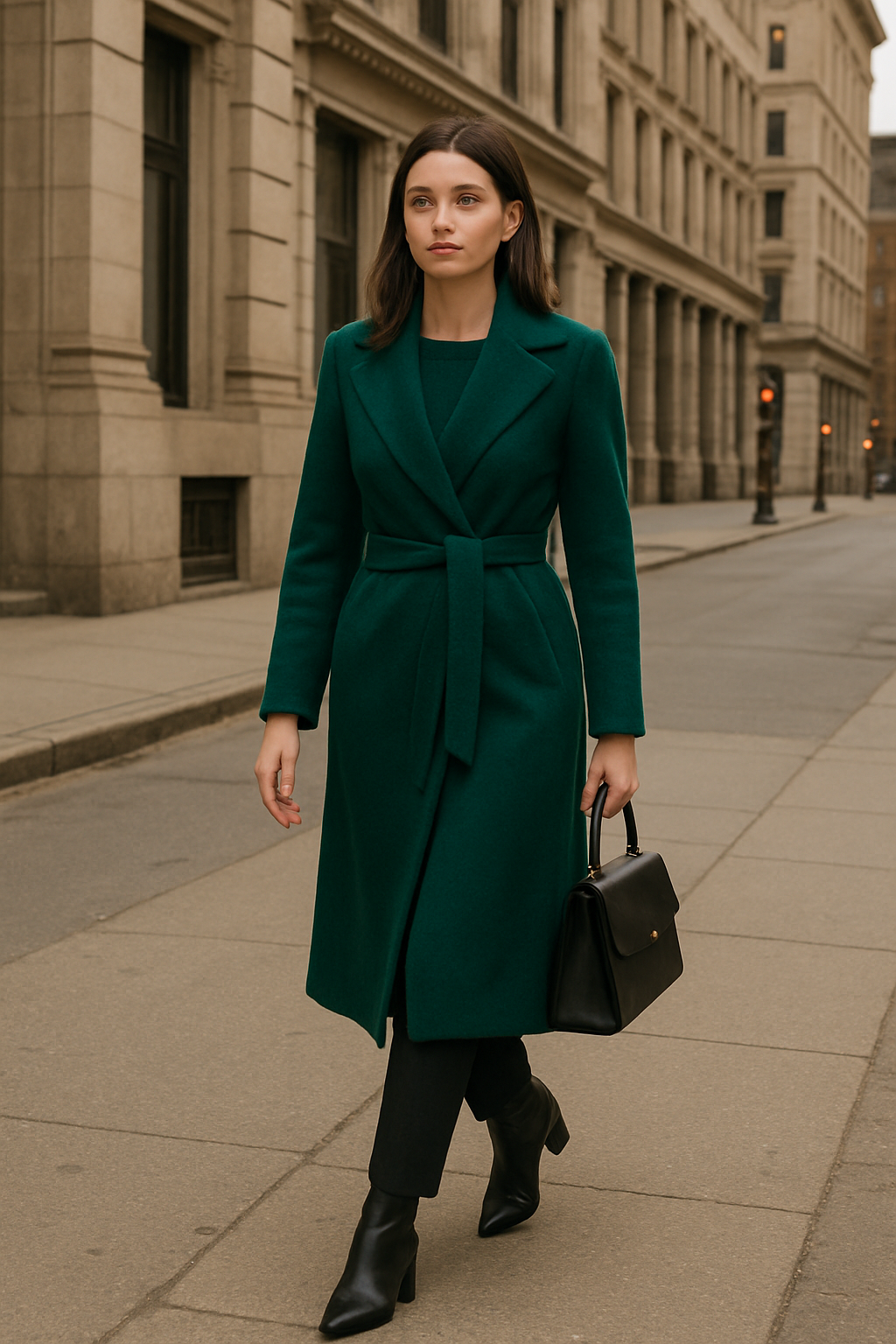 Wide-leg pants balance the coat’s length beautifully, creating elegant proportions that flow when you walk.