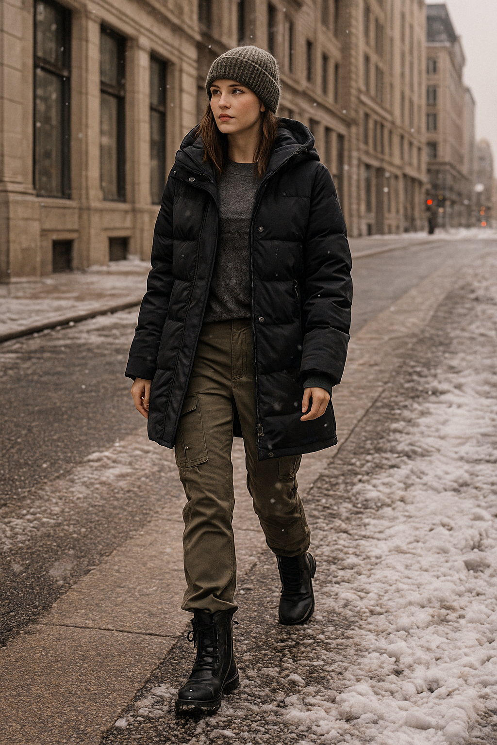 Waterproof boots and a warm beanie complete this functional yet fashionable combination that prioritizes comfort above all.