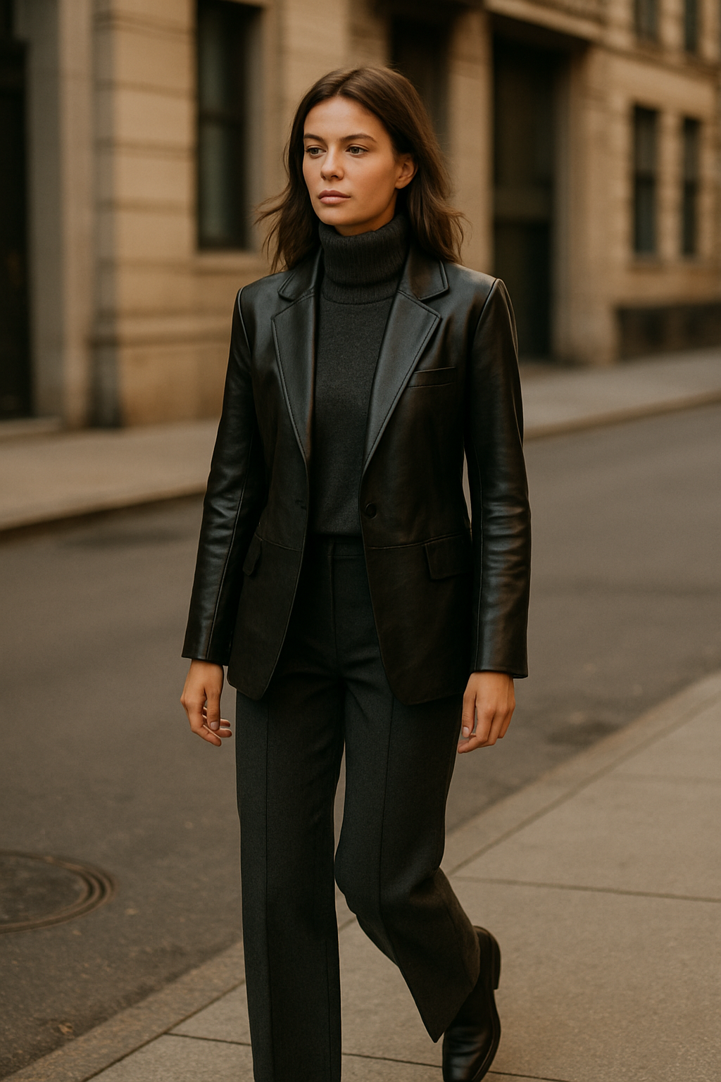 9. Leather Blazer + Wool Turtleneck + Thick Trousers
