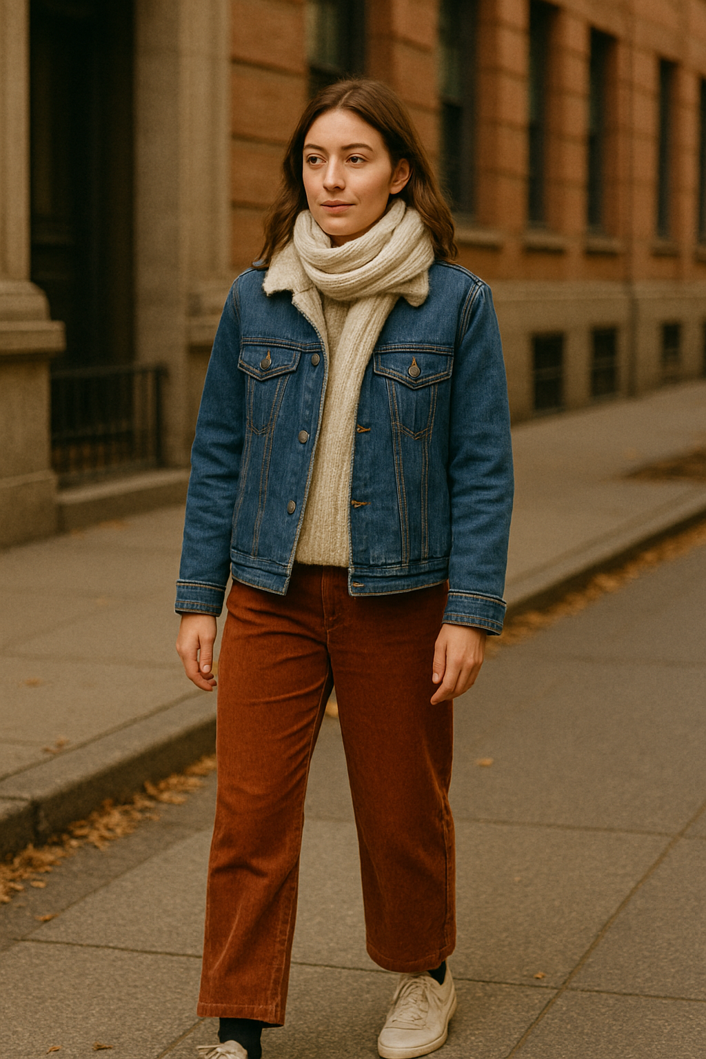 11. Sherpa-Lined Denim Jacket + Knit Scarf + Corduroy Pants